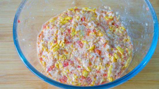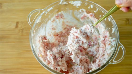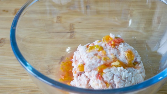 5、现在来调馅儿:猪肉、西红柿汁、盐、胡椒粉、生抽、糖,朝着一个方向搅打上劲,让猪肉把西红柿汁都吸收进去;