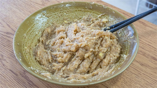 3、接着把香菇加进来后调味儿,1勺盐、少许白胡椒粉、1勺姜末、1勺蒜末、1勺生抽、1勺料酒、3勺清水,继续搅拌,一直朝着一个方向搅打至粘稠;