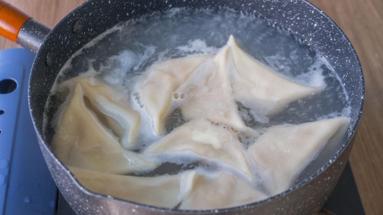 9、好了~水开了,加一勺盐下饺子,用锅铲轻轻的推动一下锅底避免粘锅,现在这个状态就不需要再动水饺了,水开后加少许凉水一共重复三次,这样煮的饺子不破皮还好吃,捞出来的时候就能隐隐约约看到红红的肉馅儿了;