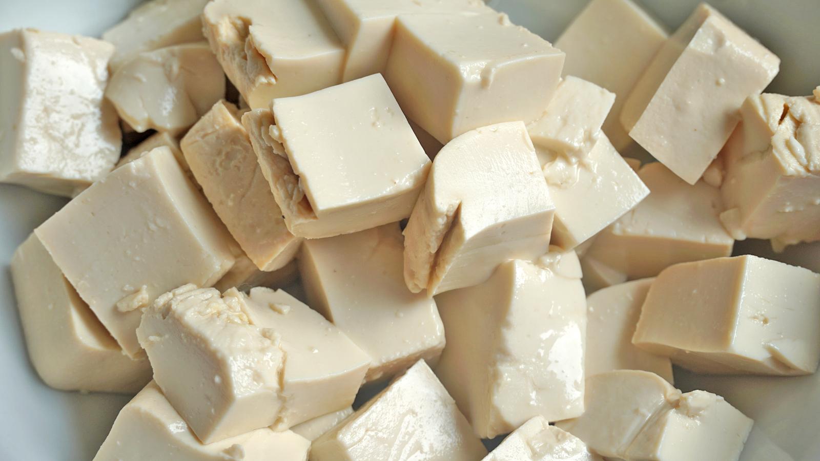 1、下面来切豆腐吧,嫩豆腐一块儿,豆腐羹主要就是讲究一个嫩字,所以最好是用嫩豆腐,切成小方块后用热水泡一泡,再加点盐,这样可以把豆腥味去一去;