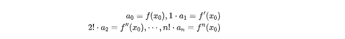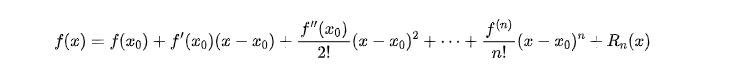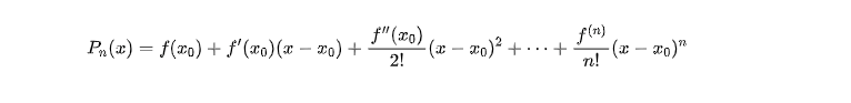当然,当 Δx 比较大的时候显然误差就会比较大,为了缩小误差,我们可以引入二阶导数、三阶导数以及高阶导数。由于我们并不知道函数究竟可以有多少阶导数,我们不妨假设f(x)在区间内一直有(n+1)阶导数,我们试着写出一个多项式来逼近原函数: