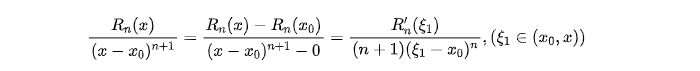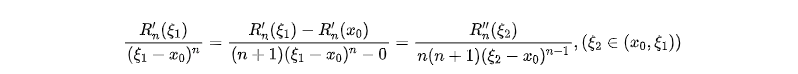 有了这个结论之后,我们再对函数 R’_n(x) 和(n+1)(x-x0)^n 在区间 (x0, ξ1) 上再次应用柯西中值定理: