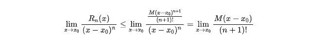 由于x逼近 x0,M是一个常数,所以这个极限趋向于0,我们可以用极限的定义很容易证明。于是我们证明了,误差 R_n(x) 是比 (x-x0)^n 更高阶的无穷小。
