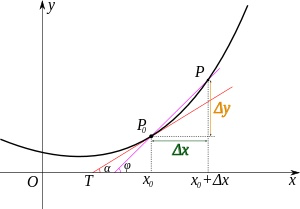 这是一张经典的导数图,从上图我们可以看到,随着Δx的减小,点 P0 和 P 也会越来越接近,这就带来了 Δy 越来越接近 Δx f'(x0)。