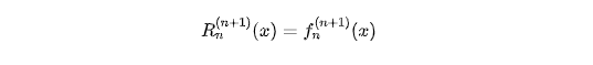 到这里,我们需要进行一个猜测,这里的步骤有一点跳跃。就连课本上都没有详细的解释,没有详细解释的原因也很简单,因为需要用到积分的知识。而读者在这里是还没有接触过积分的,不过,我们不是严谨的论文,可以稍稍放松一些。其实根据上面的公式,我们是可以有些猜测的。根据上面的规律,以及我们的目标——证明这个 R(x) 函数是一个关于 (x-x0)^n 的无穷小,所以我们可以猜测它应该是一个与 (x – x0)^(n+1) 相关的函数。