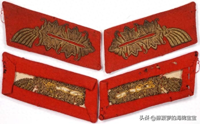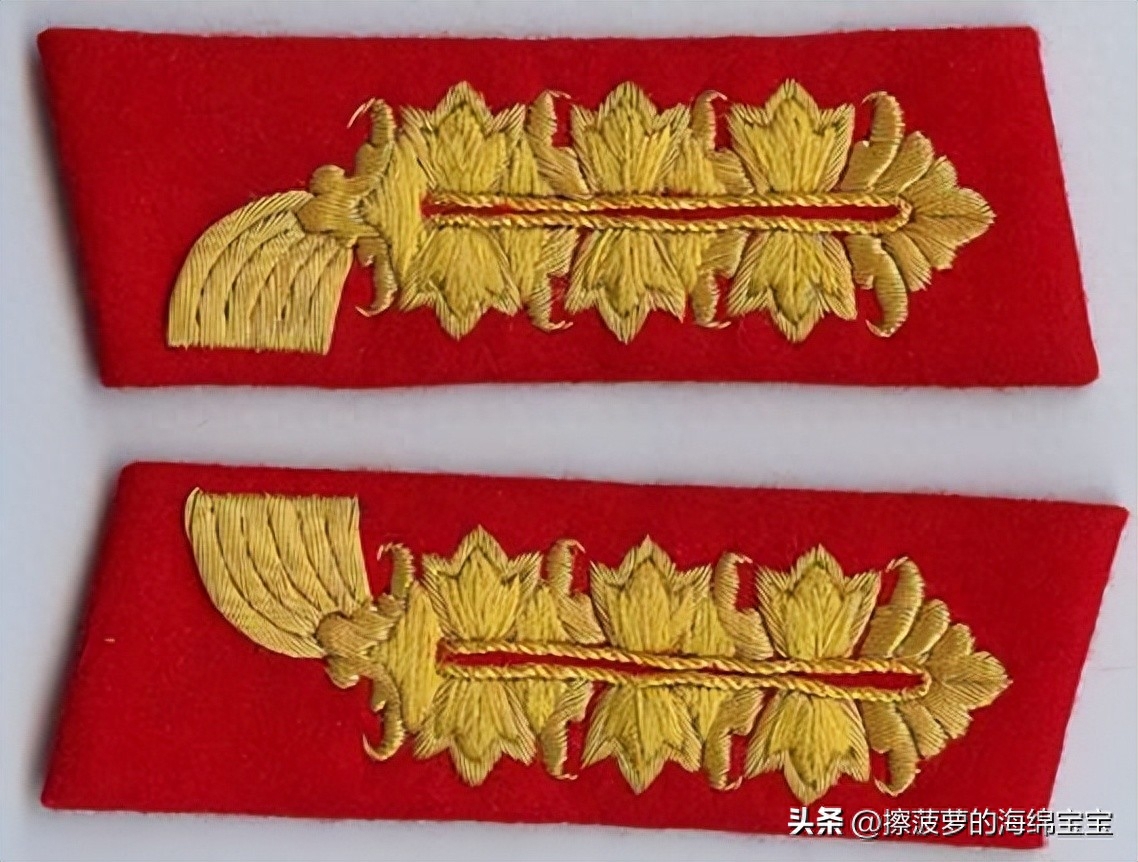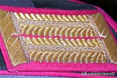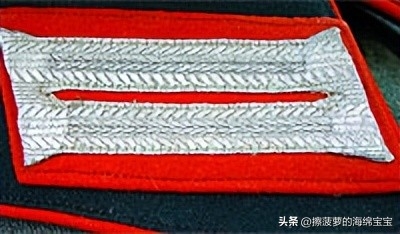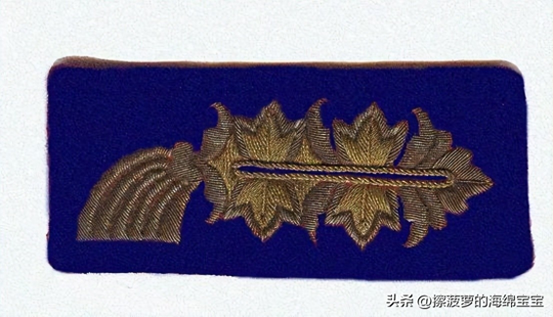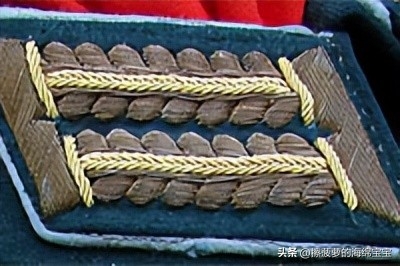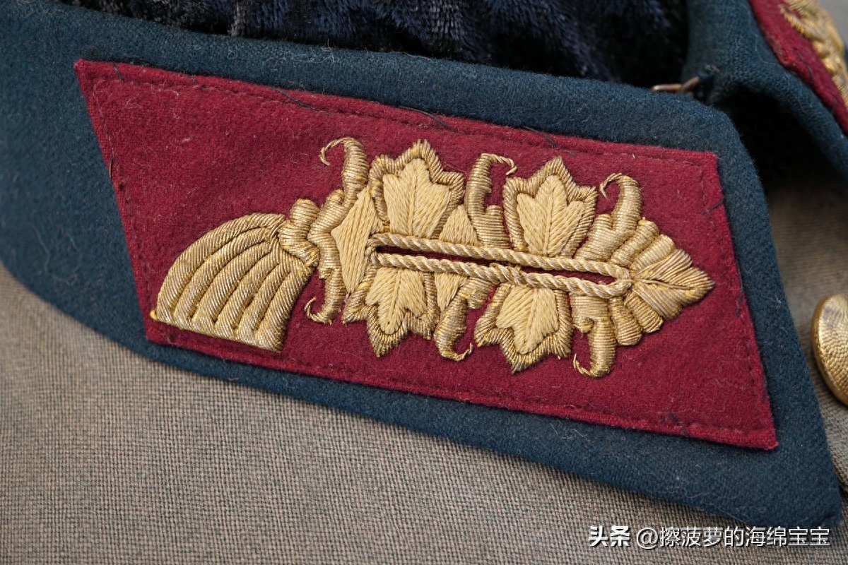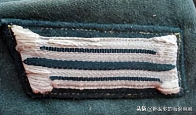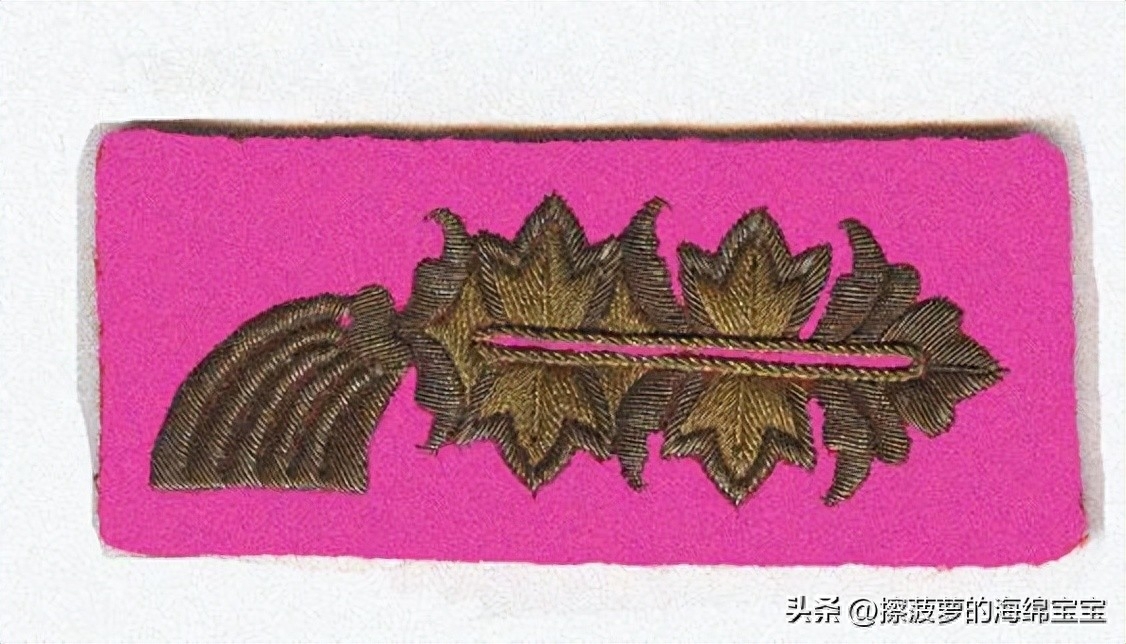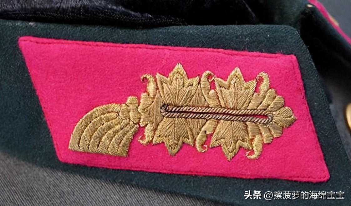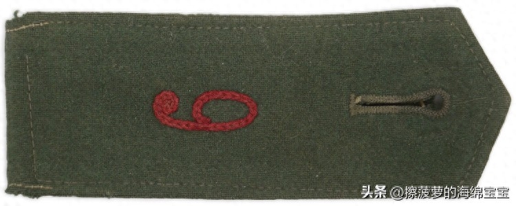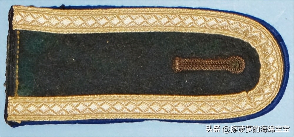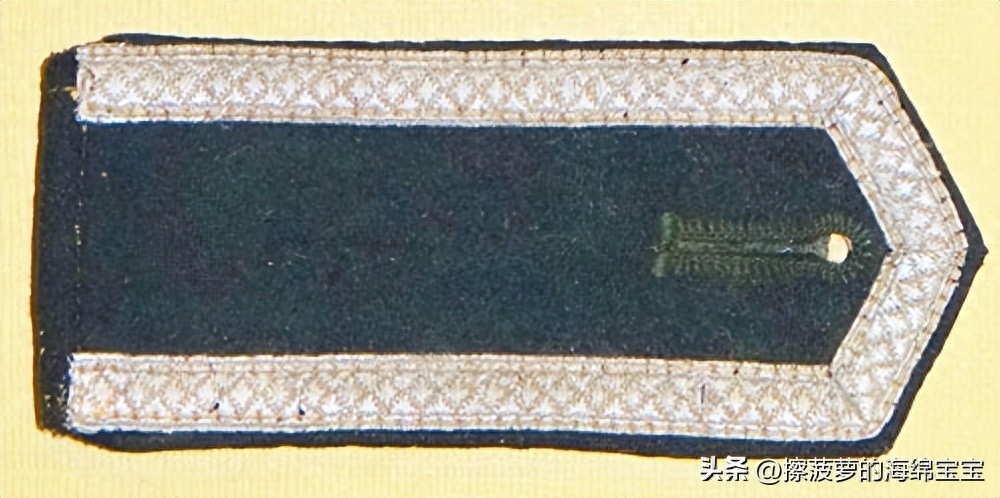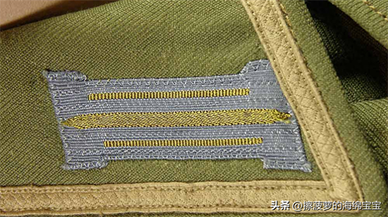 相对来说,军官野战服上的领章基本没有变化,样式和士兵的基本一致,但刺绣更好更精致。领章的底布颜色和衣领一样为深蓝绿色,编带镜位置会绣上两条彩色细绳作为兵种色。