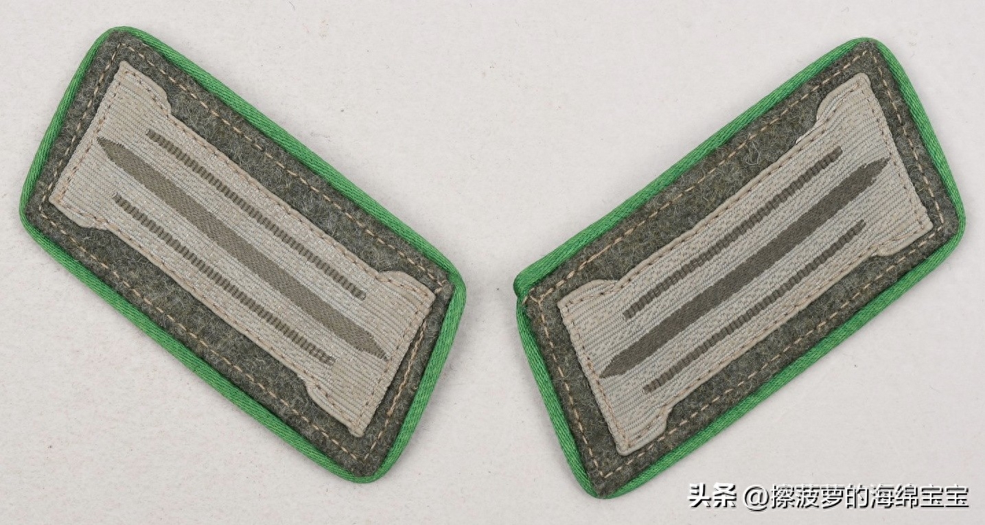 1935年底开始,野战服领章底布统一为和衣领一样的深蓝绿色。而兵种色只显示每条编带中间的编带镜上,中间条纹只显示底布颜色。