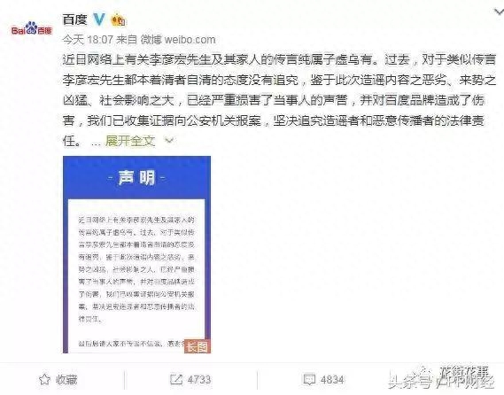 紧接着百度方面也迅速给出回应,表示有关李彦宏先生及其家人的传言纯属子虚乌有,并且目前已收集证据向公安机关报案,坚决追究造谣者和恶意传播者的法律责任。