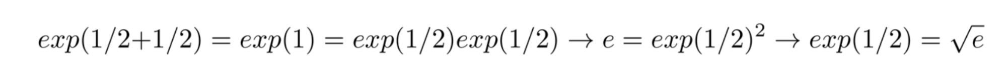 exp(1/2 + 1/2)等于exp(1)也就是e。exp(1/2 + 1/2)也等于exp(1/2)exp(1/2)。所以exp(1/2)²等于e因此exp(1/2)等于e的平方根。