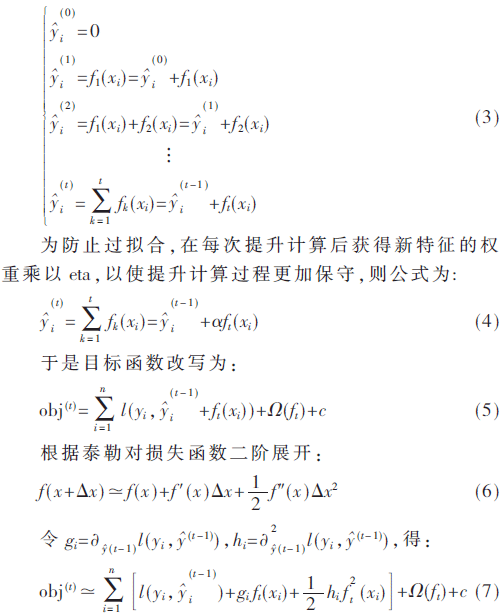 对式(2)集成树模型中的目标函数,采用additive training方法训练,即每一次保留原来的模型不变,加入一个新的函数f到模型中。