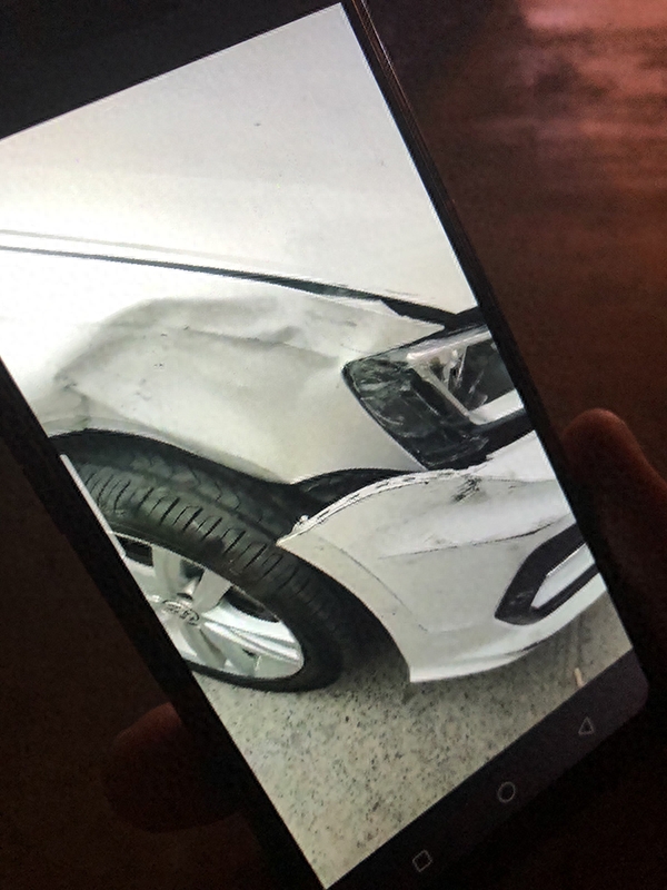 酒驾剐蹭后曾被人熄火三次,随后逃逸撞上宝马周先生向记者展示其车辆被撞的图片。