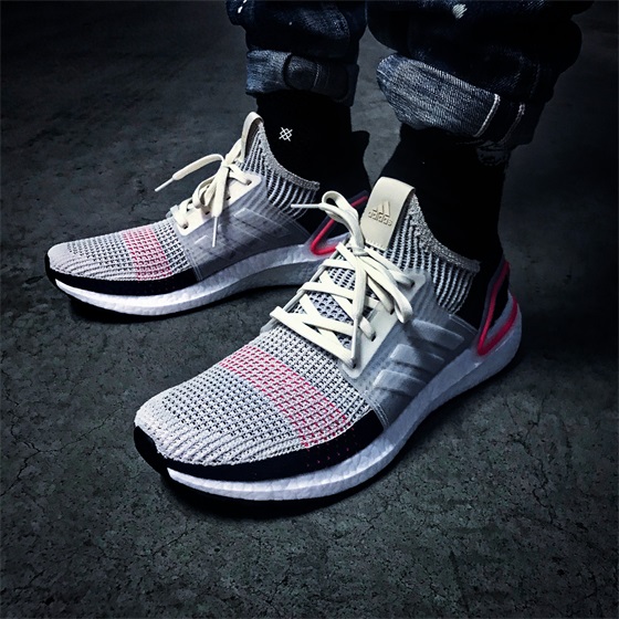 虽说是一款顶级跑鞋,UltraBOOST 19的潮流属性丝毫不弱于任何一双潮流鞋款,流线型鞋身使得上脚后鞋身非常修长,鞋面米色+海军蓝非常百搭,亮粉色点缀消除了百搭色的无聊