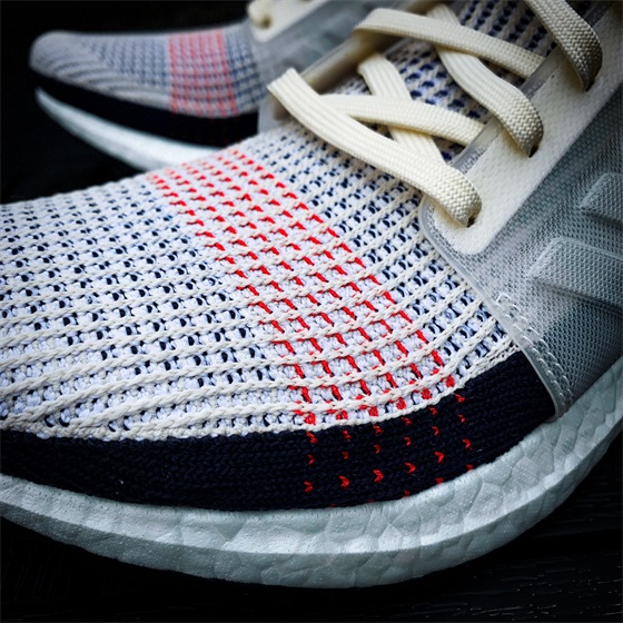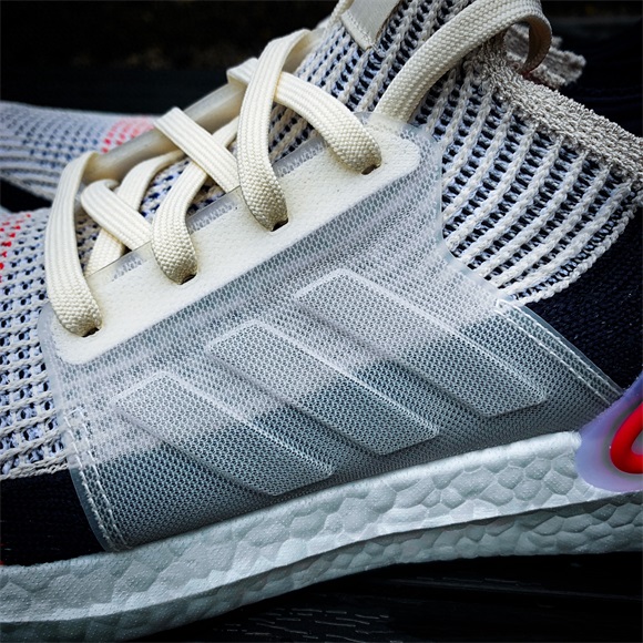 UltraBOOST 19 使用了全新Primeknit 360科技,有别以往仅适用于鞋面、鞋侧,这次采袜套式一体织成,与boost中底粘合,带来更好的贴合感,同时不同区域使用不同密度的织法,提供了更好的支撑性能。在穿着时也能明显的感受到此次鞋面更为轻软且透气。