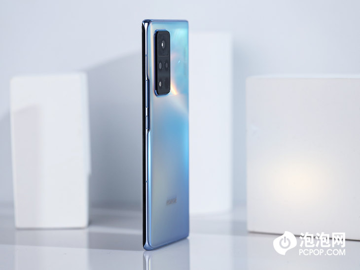 荣耀V40背面设计比较特别,摄像头模组附近有一块矩形区域采用了特殊处理。通过双层纹理镀膜工艺,让矩形区域呈现出更明显的高光效果,颜色接近机身底色,其余部分则为哑光效果。