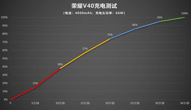 荣耀V40支持66W有线快充、50W无线超级快充,电池容量为4000mAh。充电续航部分我们都进行了实测。