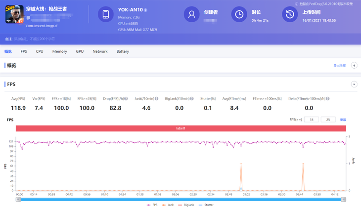《穿越火线:枪战王者》支持120帧极高帧率模式,画面特效也为全开。根据软件记录的帧数,游戏平均帧率达到118.9帧,搭配120Hz屏幕,游戏画面流畅度很顺滑,把游戏流畅度提升到一个新的等级。