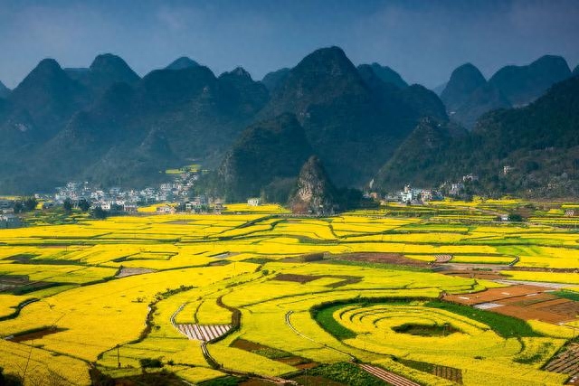 曲靖罗平油菜花在一片山中平原大地上展开,在平地上竖立着层峦叠嶂山峰,地形好似万峰林,被一望无际金色油菜花环绕,如今这里最惹眼的美景之一,当你驻足观景台向下俯瞰,金黄色的油菜花铺满山坡,云雾从山脚下涌起,随着风在山间飘荡,清晨的太阳跃出山巅,浓雾从山顶上慢慢往下退,露出金黄、明亮的油菜花田。把南国的春天映成一幅春色田园的画卷,当你在世界最大的自然天成的花海中,任谁都会感叹罗平是“金玉满堂”之乡。