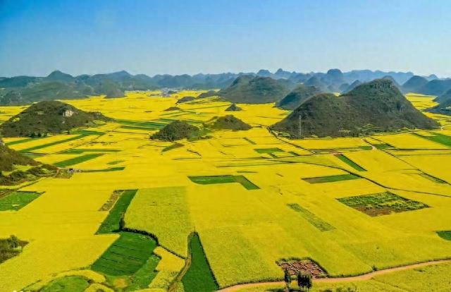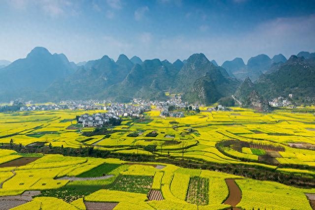 3、贵州兴义万峰林油菜花:贵州的山水风光这几年可是被全国游客认可的,兴义万峰林这个著名地方在贵州5A景区上是榜上有名,万峰林的美景不但只有夏日的田园山水画风光,你们在这个春光明媚三月,洒落在万峰林下遍布金色油菜花,更是另一番美景。