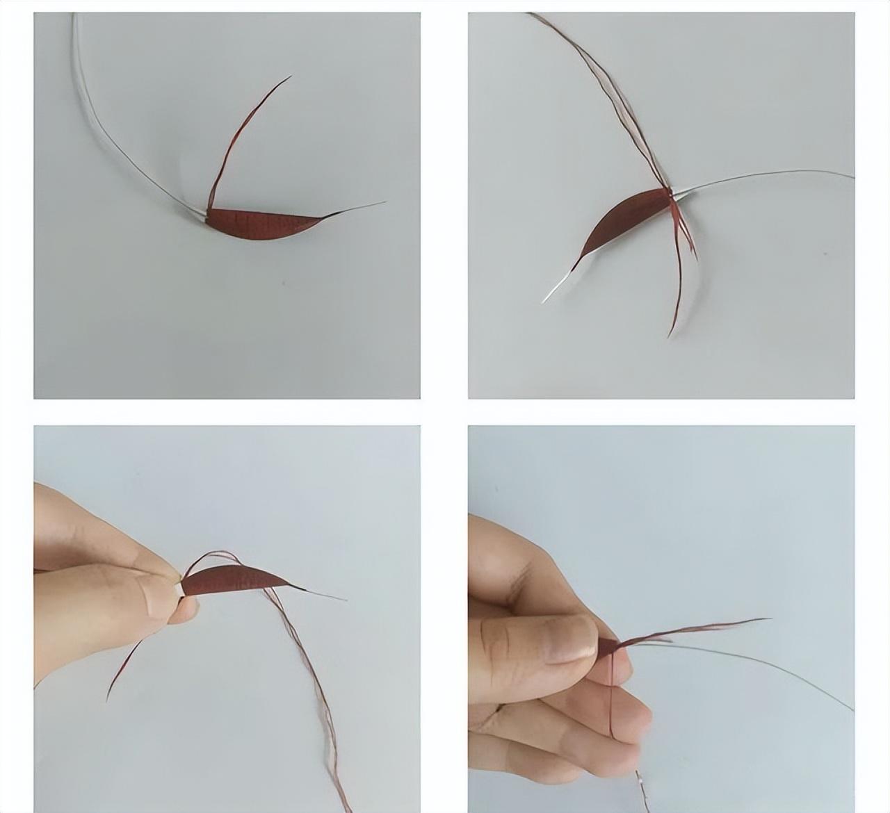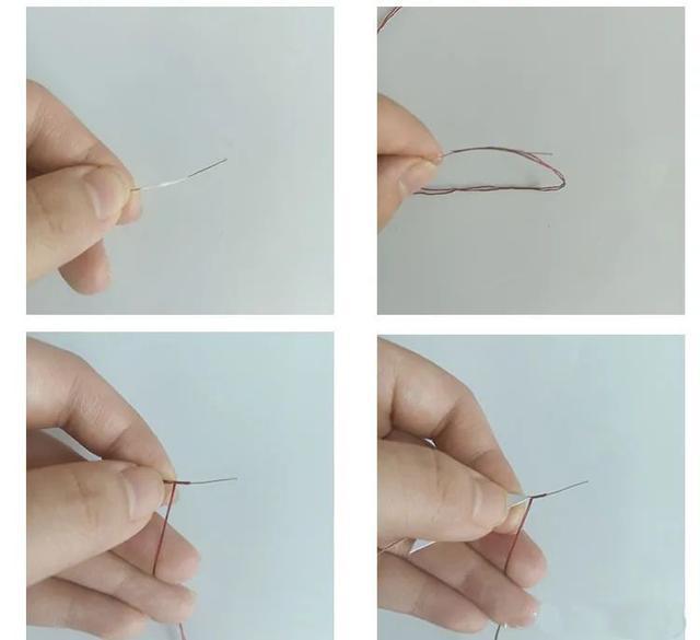 将两根铜丝合并到一起缠绕,根据花型的需要,缠绕一定的距离。将线头绕在铜丝中间,将铜丝扭紧,固定好线头之后,剪断线头收尾完成,如果担心它不牢固,可以用打火机再烧一下。缠花各种花瓣的收尾都是采用这种方法