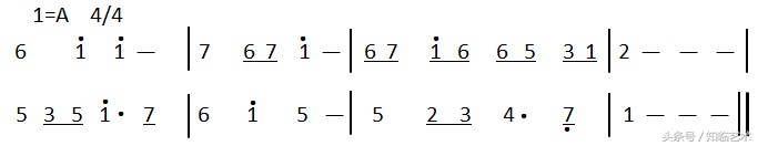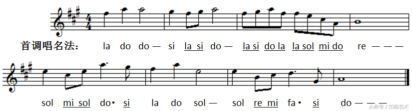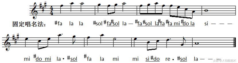 我们再用一首A大调的乐曲由五线谱来看一看。下面这首《思故乡》的片断,如果用首调唱名法来唱,五线谱上线间的唱名就很简单,但是因为调号里有三个升号,所以唱的时候也需要唱出升高后的音准,这就对个人的音高概念有一定的要求。(见上图)
