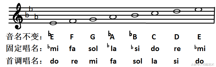 另一种叫首调唱名法,就是用什么大调的调号,就把那个音唱成do,比如bE大调的调号,就把bE音唱成do,按照调式的音级关系依次把I~VII级唱作do、re、mi、fa、sol、la、si。因为各个大调音级之间的音程关系是固定的,在视唱时可以避免出现过多的升降号,较容易把握音准。这种唱名法与简谱的记谱是对应的,所以比较适合简谱的视唱,比如简谱里面开头出现的1=bE,就是把bE唱作do的意思。(见上图)