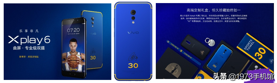 2017年4月,vivo Xplay6库里定制版正式推出,库里定制版套装包括Xplay6库里定制版手机、以及运动腕带+指环支架+定制毛巾+库里明信片等大礼包。