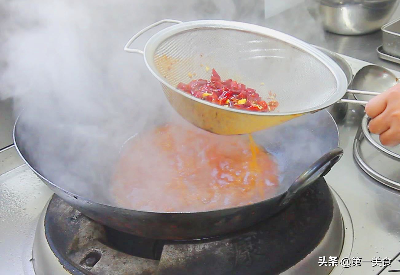 接着开始激油,锅内烧油,把油烧至7成热,在勺子中放入干辣椒20克,把热油先倒入勺中,2秒钟后,倒在盘中的蒜末和葱花上面,让香味瞬间爆发出来。热油的量不要太多,免得太过油腻。
