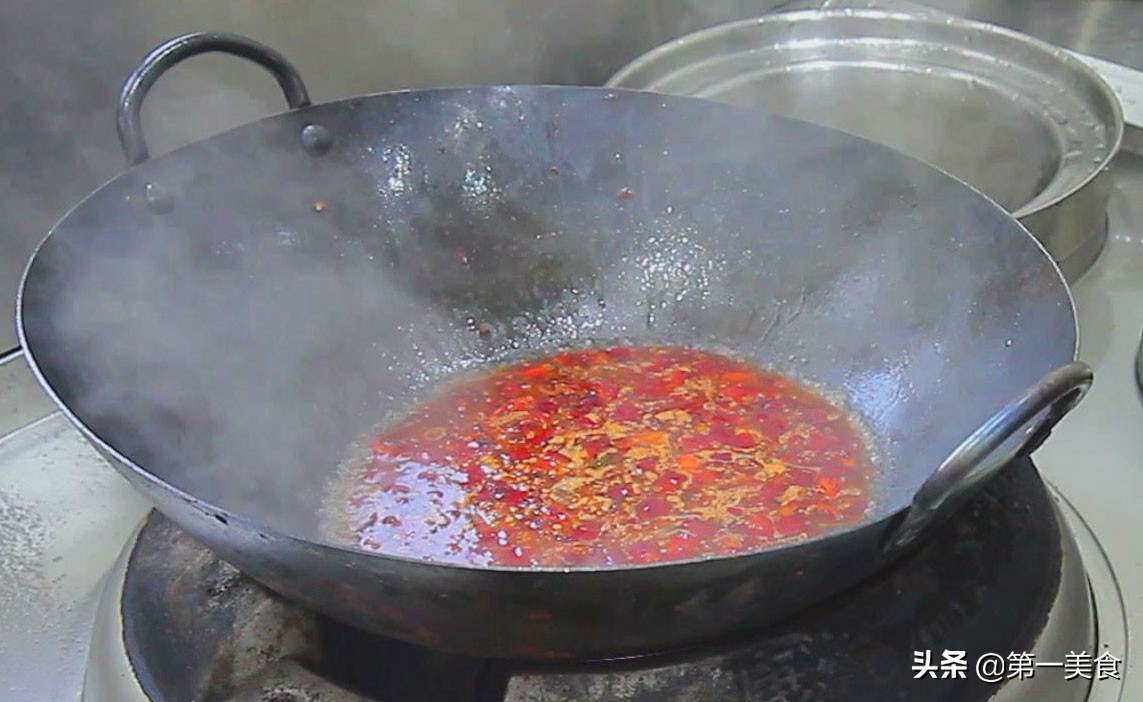锅内烧油,放入豆瓣酱50克,翻炒出红油放入蒜末,姜末,花椒和干辣椒,翻炒出蒜香,再加入适量清水,放入一块火锅底料20克,家庭做菜,用火锅底料,味足又省事。