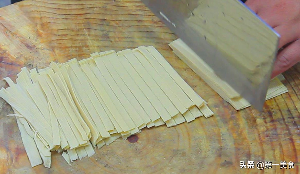 在腌制的时间,我们再准备一下配菜,豆腐皮两张,划成两片,再切成丝。