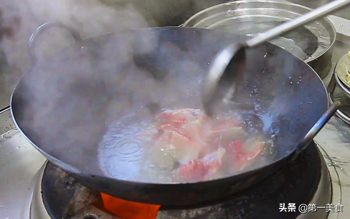锅中再添水,冷水放入腌制过的鱼头和鱼骨焯一下水,冷水下锅,能有效的去除血水,减少异味,等到水开后,撇去锅中的浮末,焯水1分钟左右。