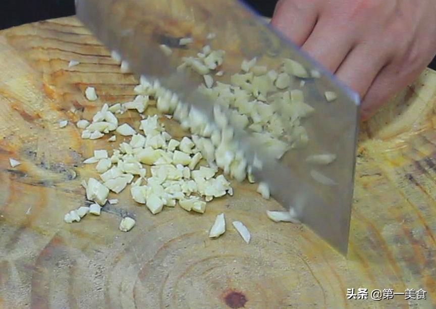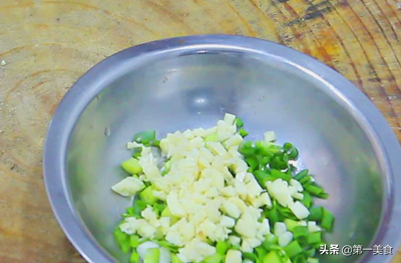 下面,再准备一下激油用的小料,小葱切成葱花,放在盘中,大蒜拍扁,切成碎末。