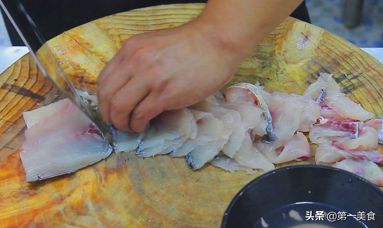 同样去除另一半鱼,把鱼骨剁成小段,鱼头从中间剁开,清洗干净后,放在盆里,剔除鱼的大骨,鱼皮照下,斜刀片成鱼片。