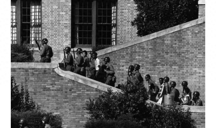 1957年小石城事件 / 9名黑人学生被禁止进入白人学校随后被警卫队护送离开