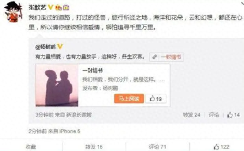 杨树鹏以一封情书作为两人感情的终结,张歆艺也在离婚的时候为杨树鹏送上最真挚的祝福。