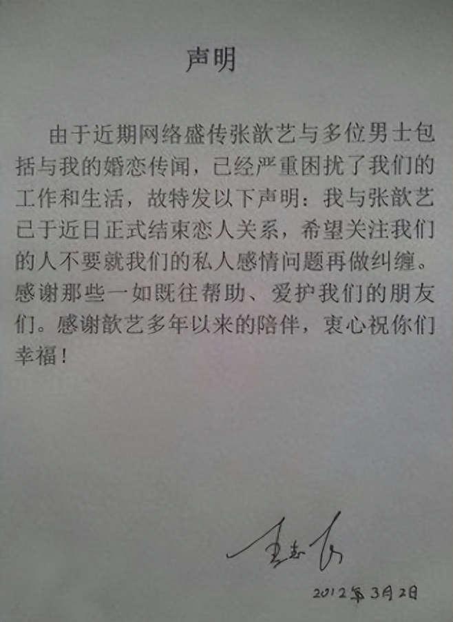2012年3月,王志飞在网络上发文声明两人已经分手。
