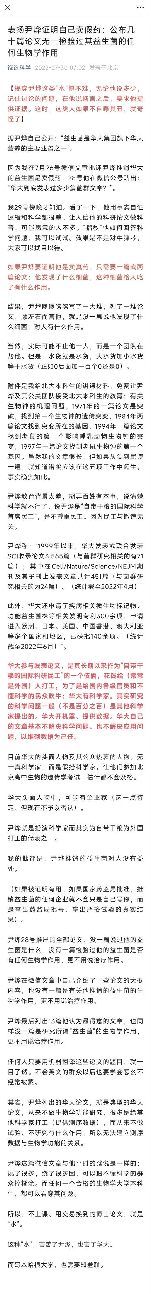 中国生物物理学会肠道菌群分会副会长蓝灿辉表示,华大的益生菌不是药,但是也不是‘三无’产品。华大把它定义为食品范畴。饶毅说它是假药,有点偏颇。但尹烨的问题是在带货的时候太绝对了,益生菌到底有什么属性,行业还没定论,华大宣传中不严谨地推销对减肥、抑郁都有用的观点,缺乏科学循证,很容易误导消费者,这或许就超出了生意的底线。