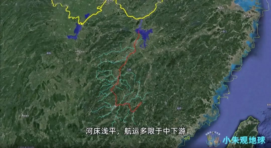 赣江全长744千米,是长江的第七大支流,江西省最大的河流,年均径流量为687亿立方米。但由于水量分布不均,河床浅平,航运多限于中下游。