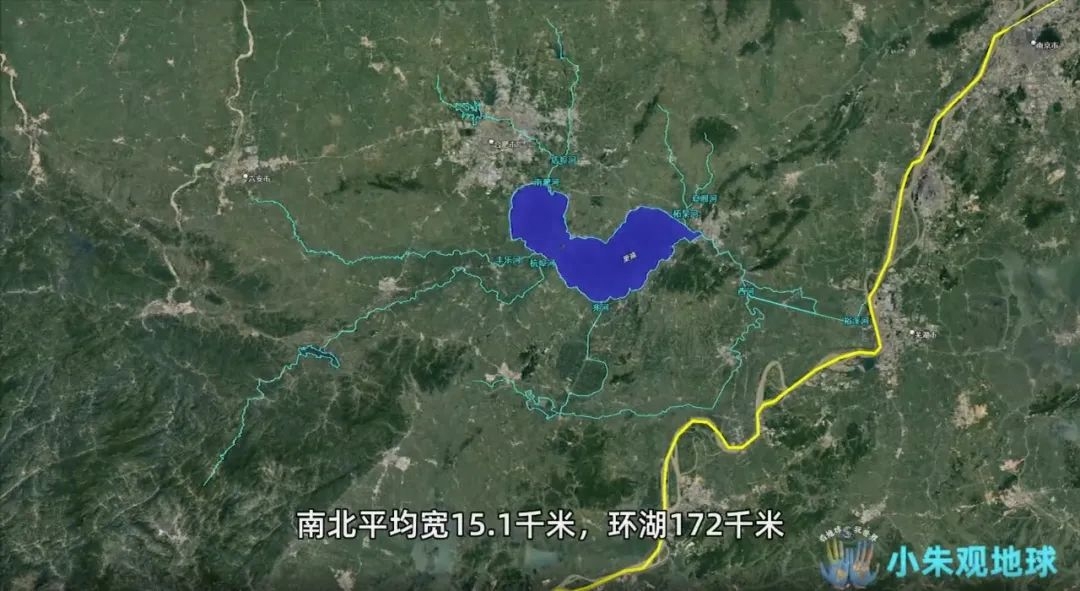 巢湖是中国五大淡水湖之一,东西长54.5千米,南北平均宽15.1千米,环湖172千米。
