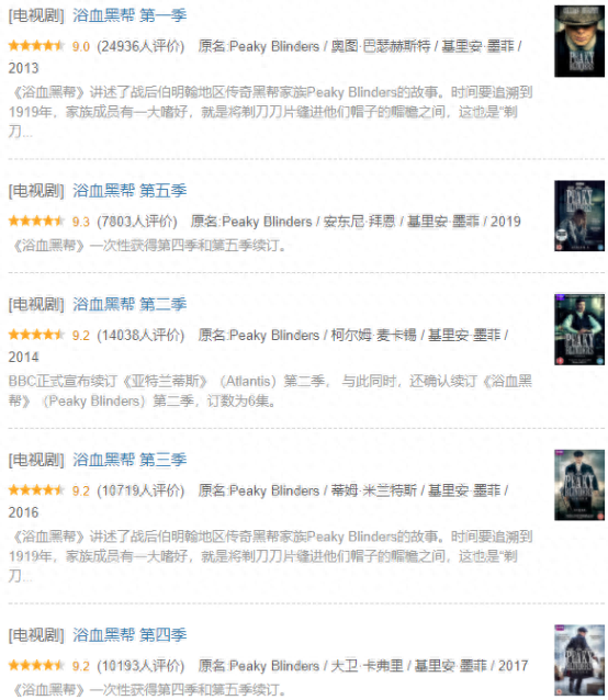 因此,这部剧一出世就得到了广大好评,在豆瓣第一季就受到了9.0的得分还有2W+人数的评论,此后一路高歌,第二季、第三季、第四季也都收到了9.2的好评,第五季更是达到9.3。被称为是“BBC历史上最经典的黑帮剧作”。