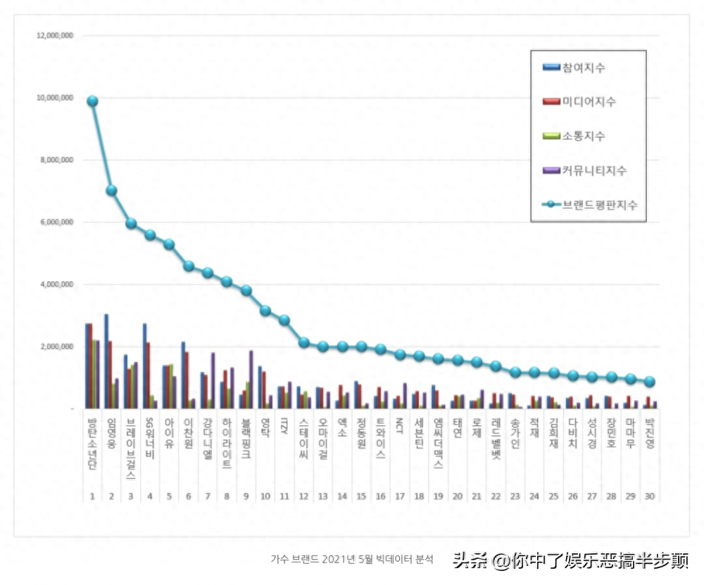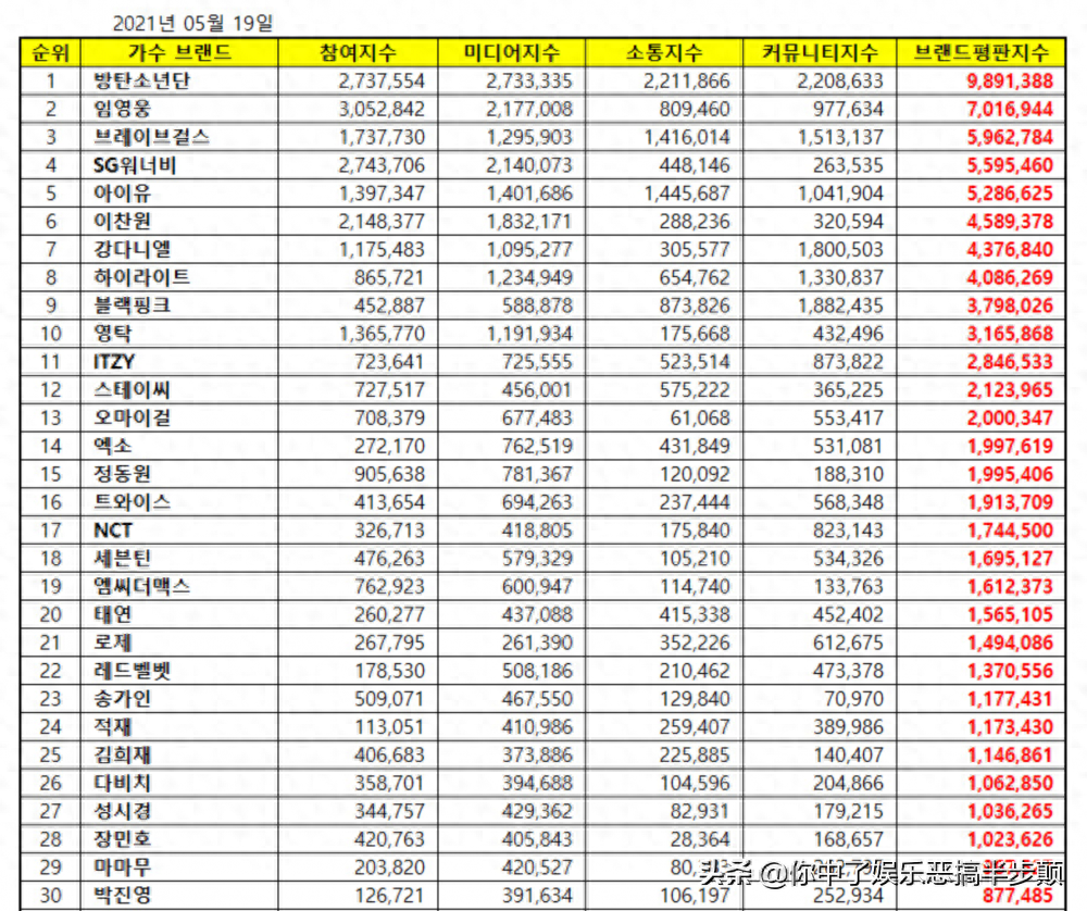 韩国权威专业调查机构Korea Institute of Corporate Reputation统计分析了2021年4月19日到5月19日观众消费参与指数、媒体活动、传播、线上话题等数据排出了5月份韩国最具价值歌手排行榜!