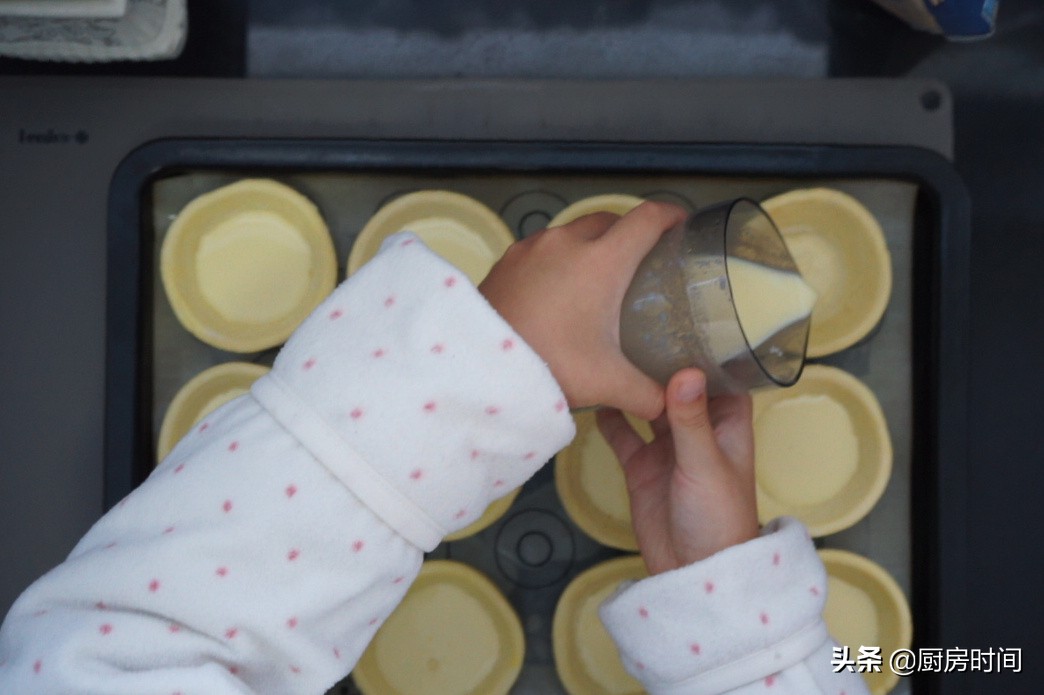 下面就是向蛋挞皮中添加蛋挞液了,添加前,先将蛋挞皮整齐地码在烤盘里,然后再把蛋挞液挨个倒入蛋挞皮中,倒蛋挞液的时候,千万不要倒得太慢,一般不要超过7分满的量就可以了。