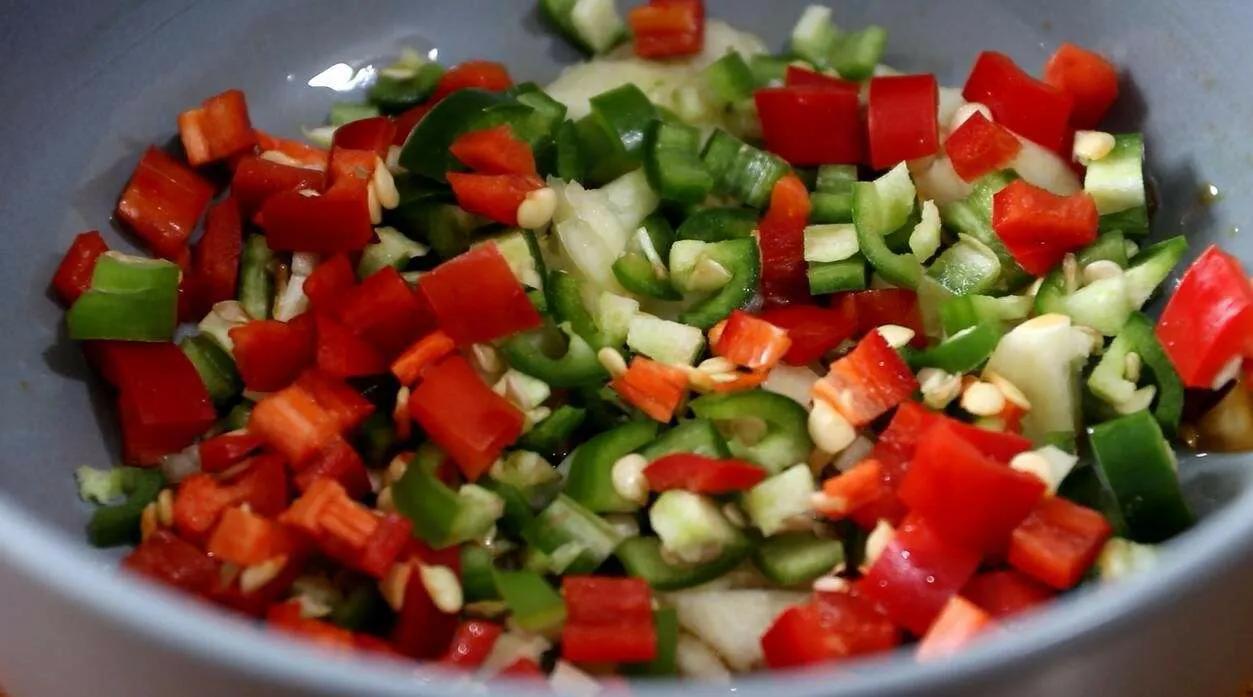 5.水烧开后给它慢炖三分钟,三分钟后把准备好的青红尖椒丁加进来。快速的翻炒均匀就可以出锅食用了。