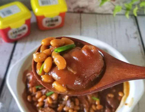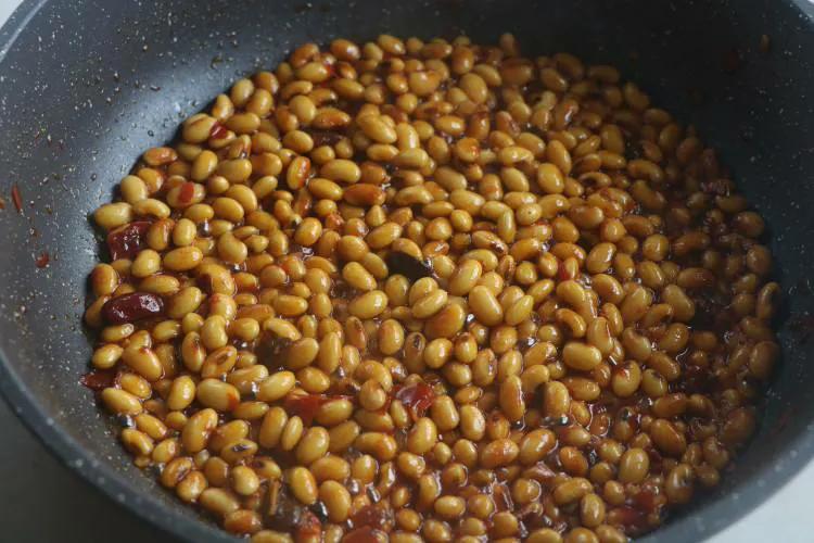 3.水烧开后转中火给它慢炖35分钟,35分钟后用大火收至汤汁浓稠。就可以出锅食用啦。用这个方法做出来的黄豆营养美味又下饭。每天早上来一小盘,配着小米粥喝别提有多下饭了。
