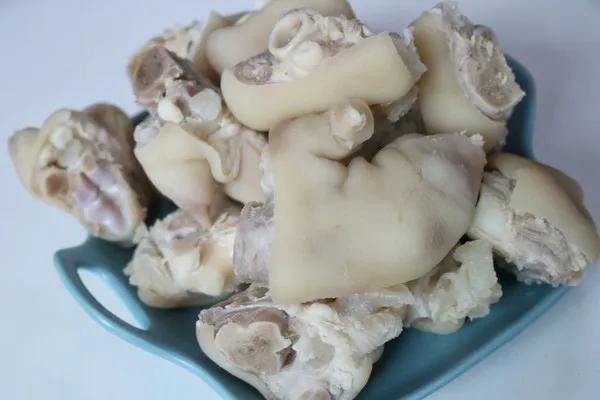 1.首先准备新鲜的猪蹄两个给它切成小块,然后放在清水中给它冲洗干净。黄豆一小把,放在清水中给它浸泡两到三小时。