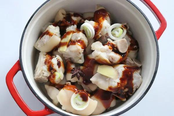 2.把准备好的猪蹄放在冷水锅内,放入葱姜啤酒去腥。不用盖盖子大火烧开。水烧开后撇去里面的浮沫,转中火继续煮沸五分钟。五分钟后捞出备用。