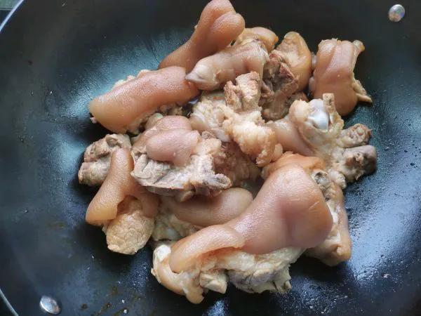 3.炒锅烧热放入食用油,油热后把准备好的猪蹄放进去炒香。把猪蹄表面的水分给他炒出来。然后在里面加入两勺生抽、半勺老抽。放入一小把白冰糖,少许的精盐,蚝油,然后再加入适量的开水。