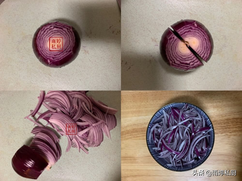 1、洋葱剥除表皮,把两端稍稍切除一些,然后放在菜板上一分为二切开,把半个洋葱扣放在菜板上,顺着洋葱纹理从一侧往洋葱中心位置切成细丝,这样切出来的洋葱丝比较均匀。