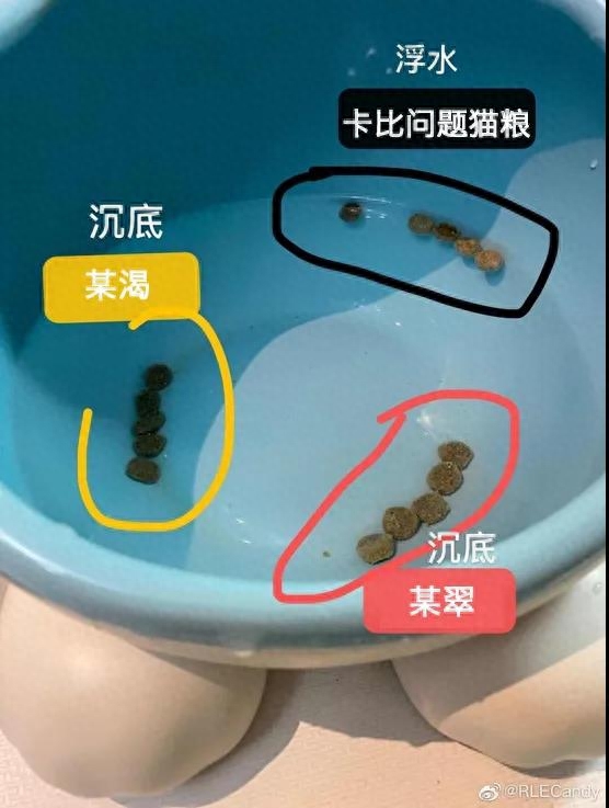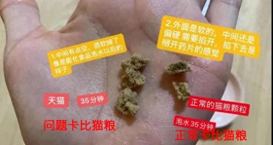 无质量问题的卡比猫粮,和卡比问题猫粮做泡水对比测试: