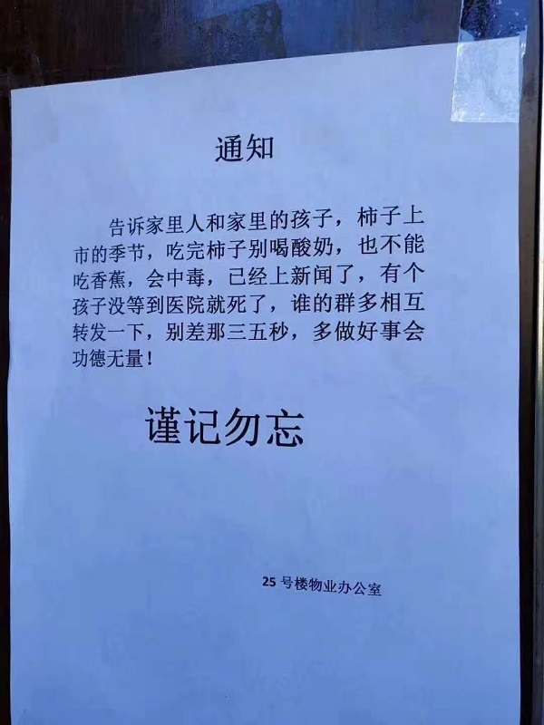 河北石家庄的市民李女士很喜欢吃柿子,每到柿子成熟的季节也是她大饱口福的时刻,日前李女士的母亲转给她一条微信。“微信上说,‘通知告诉家里人和家里的孩子,柿子上市的季节,吃完柿子别喝酸奶,也不能吃香蕉,会中毒,已经上新闻了,有个孩子没等到医院就死了,谁的群多相互转发一下,别差那三五秒,多做好事会功德无量!谨记勿忘’。”原来李女士的母亲在自己的朋友群里看到这个消息,立刻就想到爱吃柿子的女儿,赶紧把微信转给女儿。