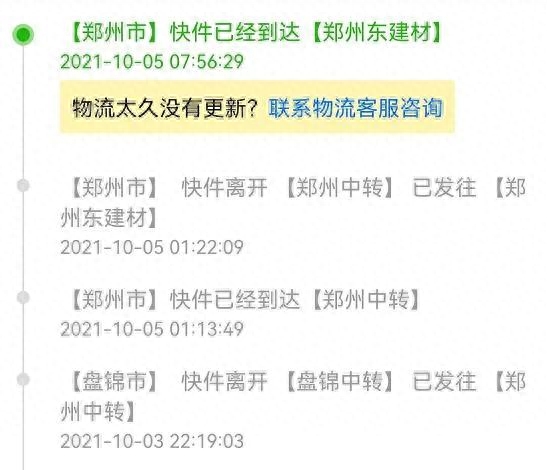 家住郑州市商都路附近的李先生从辽宁省盘锦市发来一个快件,快件从盘锦市发出绵延一千二百多公里不到两天时间就抵达了郑州市东建材中通快递站(物流信息显示2021-10-03 22:19:03发往郑州——2021-10-05 07:56:29已经到达郑州东建材),看着手机上的物流信息李先生对当今社会的发展和物流之快充满了幸福感,由衷的赞叹现在物流真方便!一千多公里一天多就到了。现在是一大早,估计上午就能送达到门口的菜鸟驿站。